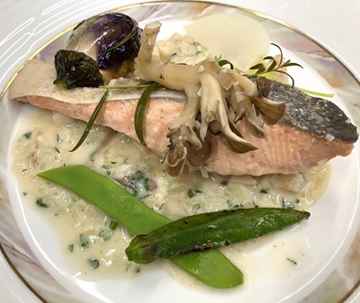 魚料理 ・本日の魚とキノコの蒸し煮、白ワインソース |