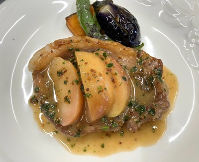 肉料理 ・豚ロース肉と地元産リンゴのソテー、粒マスタードソース |