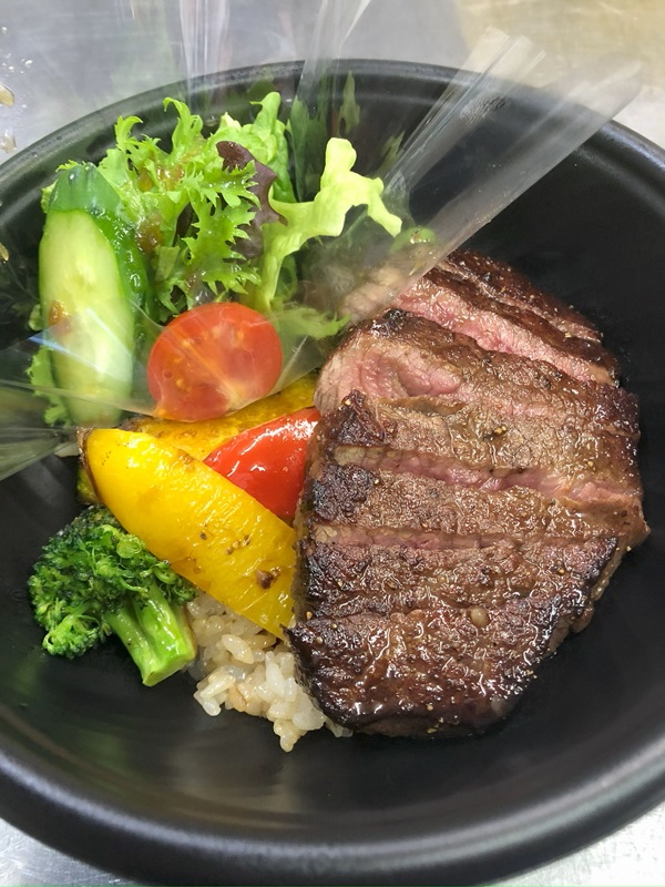 ガーリックライスの上にみりん?油で絡めた牛肉と野菜を添えたどんぶり風です。